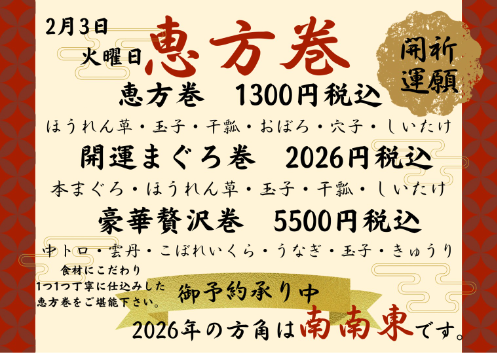 食材にこだわり、一つ一つ丁寧に仕込みした恵方巻をご堪能ください。2026年の方角は南南東です。